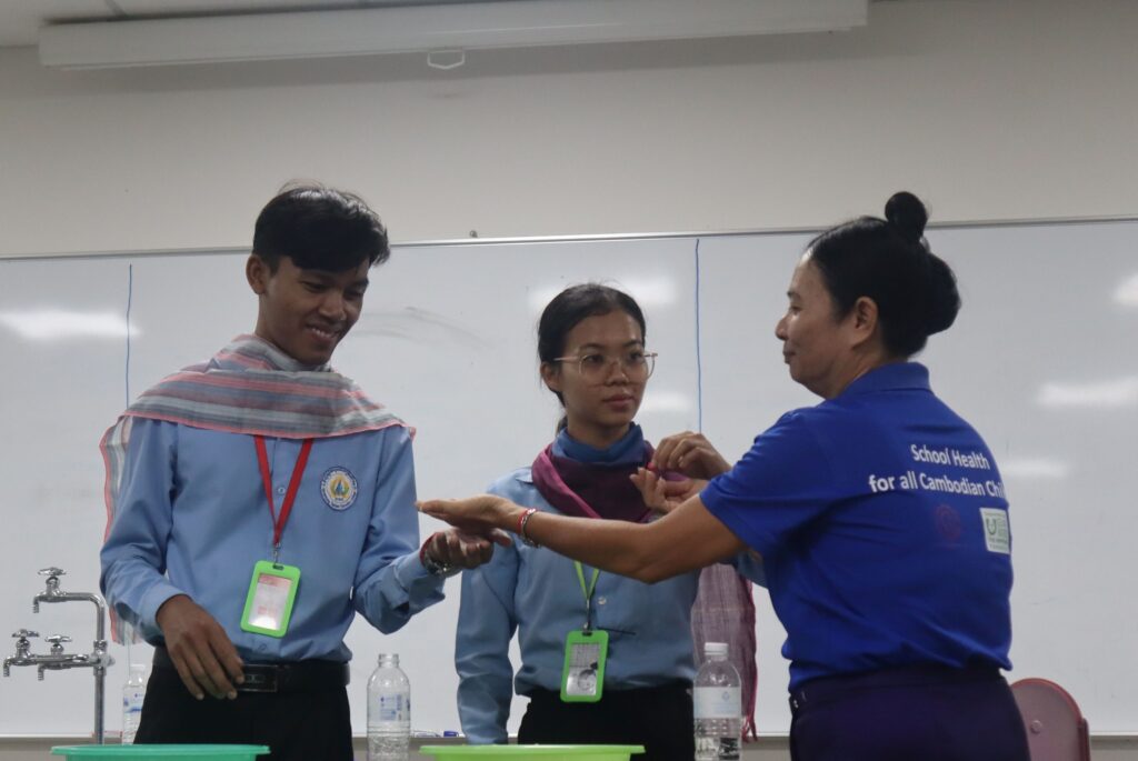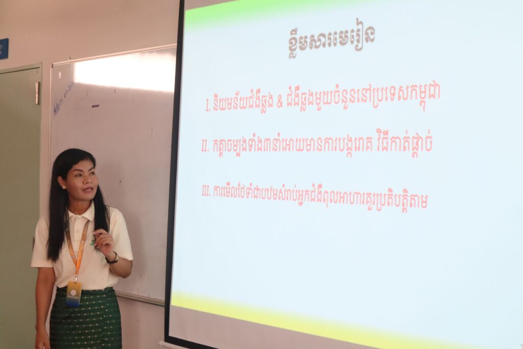 プノンペン教員養成大学のSreyry先生による『感染症とその予防』、バッタンバン教員養成大学のSomnea先生による『歯の健康』についての授業が、それぞれの大学3年生に向けて行われました。