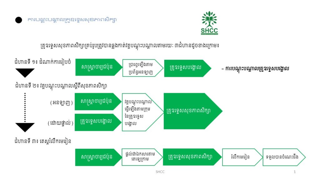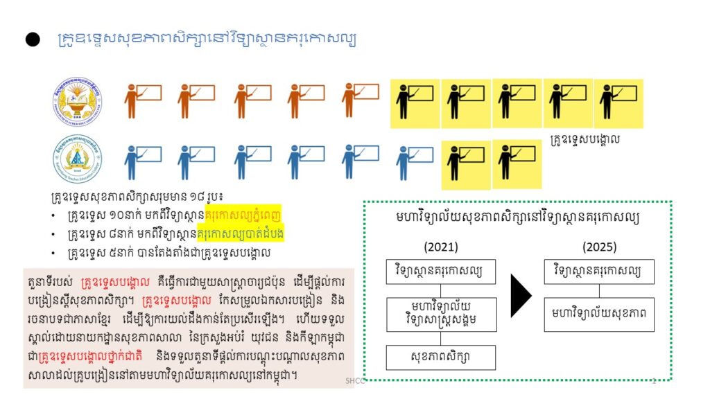 The project provides school health training for lecturers who teach the subject of ‘School Health’ in the primary teacher training course at the Phnom Penh Teacher Education College (PTEC) and the Battambang Teacher Education College (BTEC).