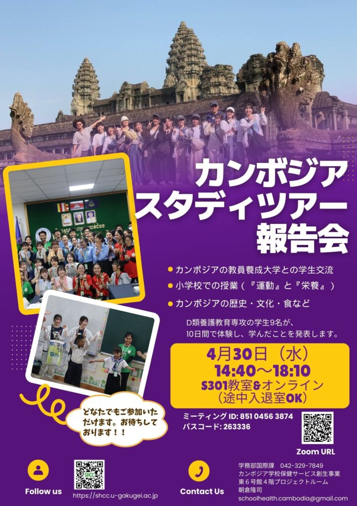 東京学芸大学D類養護教育専攻の学生9名(1年生5名、2年生2名、3年生2名)が参加し、カンボジアの教員養成大学(バッタンバン教員養成大学、プノンペン教員養成大学)の学生との交流、附属小学校での授業、歴史・文化施設の訪問などの内容で行われました。